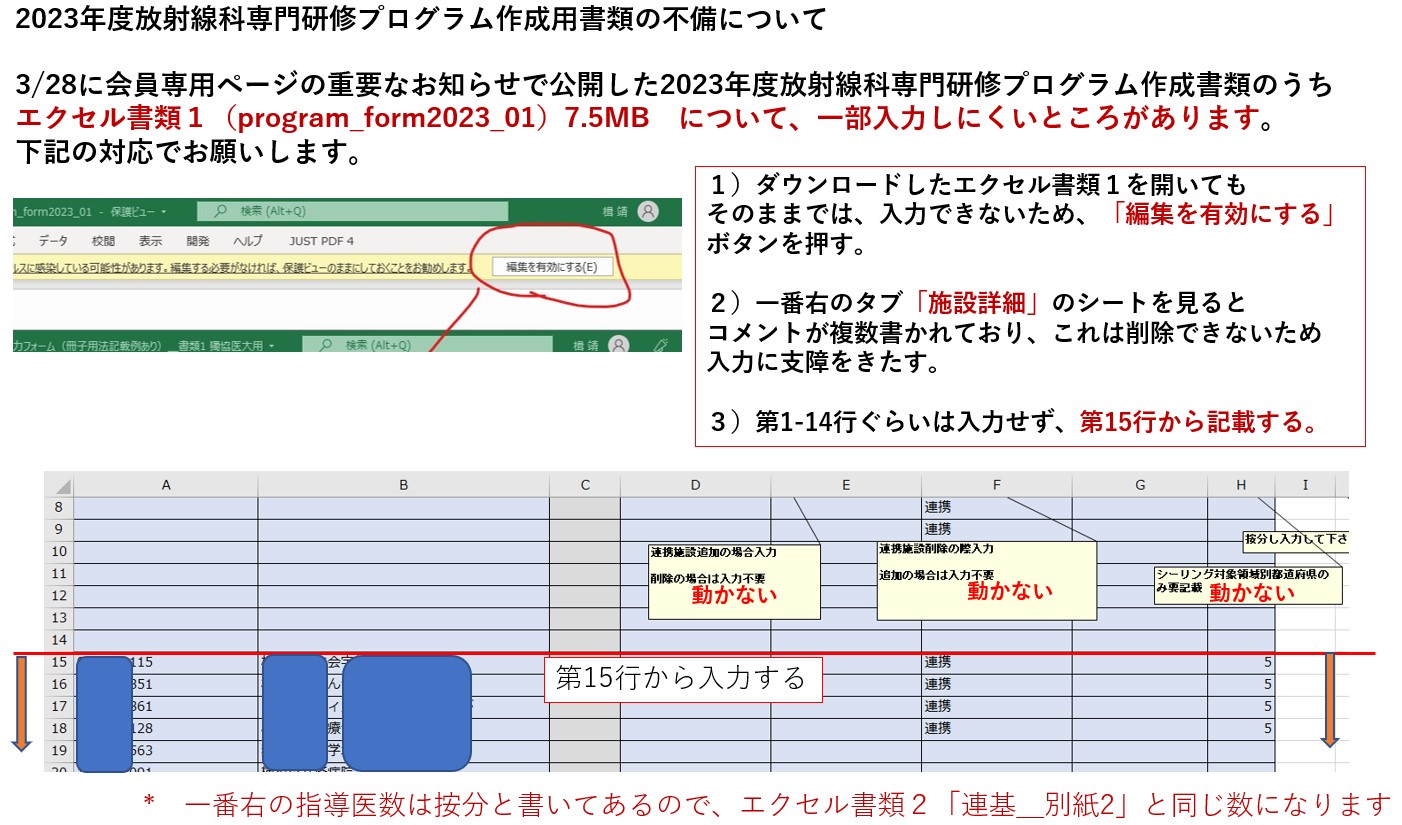 書類1は機構から正式なものが届きましたら、すぐにご連絡しますので現在の書類で記載内容の準備をしておいてください。提出締切りは4月末日、方法(データのみ、どこへアップロードなど)については後日お知らせ致します。新規プログラムを申請予定の施設は学会事務局 office@radiology-sys.jpまでお問い合わせご連絡下さい。